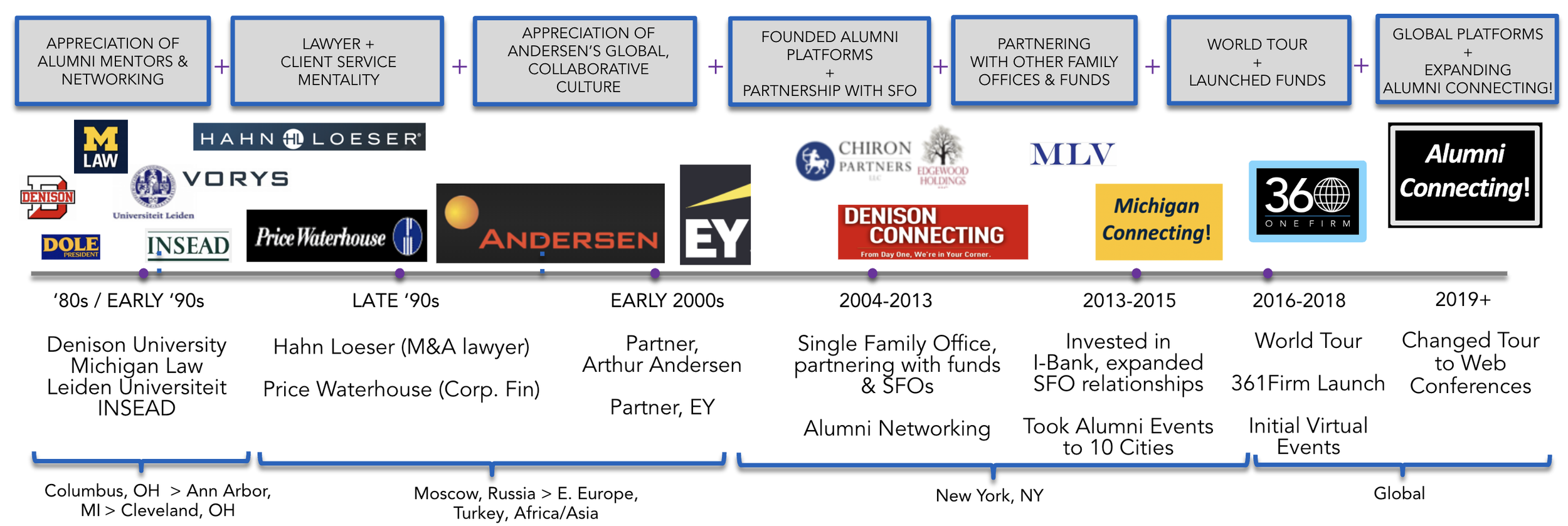 Moving to New York in ‘04 after a stint in Europe, founder Mark Sanor (Denison ‘90, Michigan Law ‘93) was underwhelmed by alumni events. So, we started our own, focused on roundtables where everyone shares ASKs. As we grew to 300 at our NYC Denison Connecting! event, we divided roundtables by shared interests. In ‘15, we took it to Europe. In ‘18, we added Michigan Connecting! and started Zoom events.